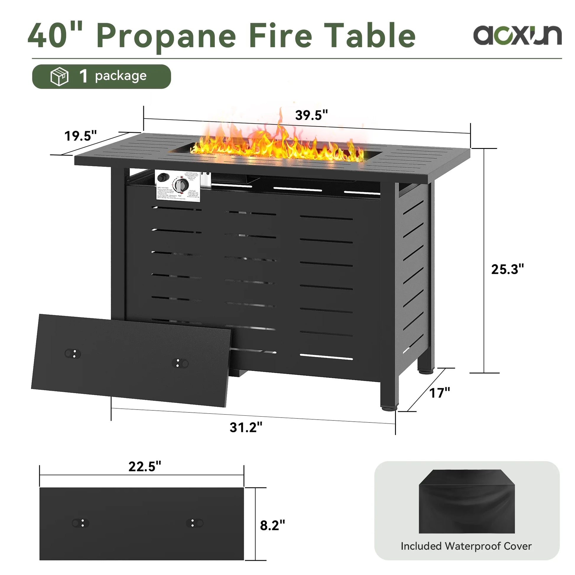 Elevate your outdoor gatherings with our stylish and functional Aoxun 40" fire pit table, crafted to blend durability with contemporary design. Constructed from sturdy steel material, this fire pit table is built to withstand the elements while ensuring long-term performance and stability. Topped with a waterproof PVC cover that protects the fire pit from rain, dust, and debris when not in use, extending the life and maintaining its sleek appearance. Featuring an efficient burner, the fire pit table delivers consistent and reliable warmth, creating a cozy atmosphere for evening gatherings. In addition to its functional fire pit capabilities, this piece doubles as a stylish table when the fire is not in use. The table surface provides ample space for drinks, snacks, or decorative items, making it a versatile addition to your outdoor area. Its elegant design seamlessly integrates into any decor, providing both a practical heat source and a sophisticated table option for versatile outdoor entertaining.