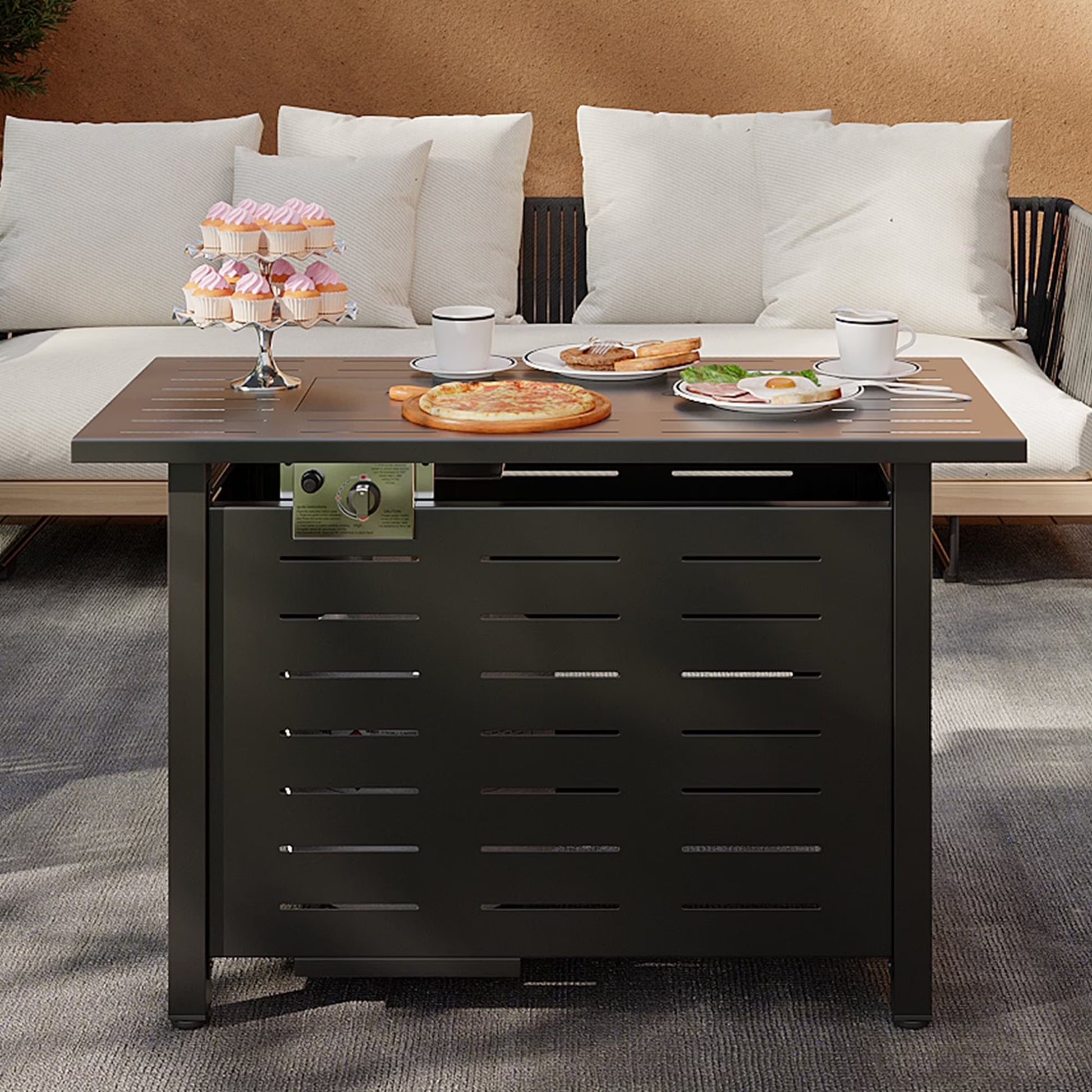 - ● Equipped with a powerful burner capable of producing 50,000 BTU of heat, this outdoor fire pit table offers impressive warmth and comfort. Its high heat output is perfect for creating a cozy ambiance during cool evenings and enhancing your outdoor gatherings.