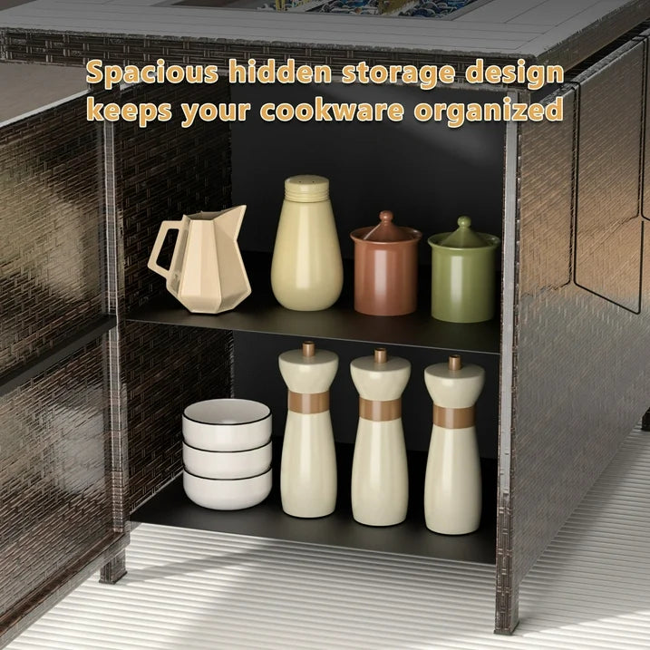 The gas outdoor fire table is made of sturdy aluminum and reliable all-weather-resistant PE rattan for impressive strength and durability, holds propane tanks up to 20 LBS; The burner and control panel are made of stainless steel for a longer working life