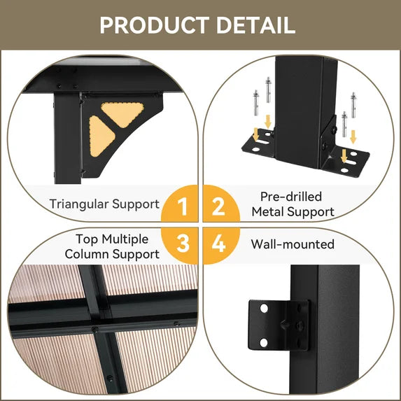 - 【Premium Material & Excellent Load-bearing】The top of the pergola has a remarkable load bearing of 55 lbs/㎡, which is resistant to various complex weather conditions as long as it is wall-mounted with expansion bolts. Besides, the polycarbonate top is able to reflect 99% of UV rays and thus provide UV protection. Besides, the maximum wind resistant grade is 7(31-38mph) and the maximum snow loading depth is 4 inches after you install the ground nails and expansion bolts.