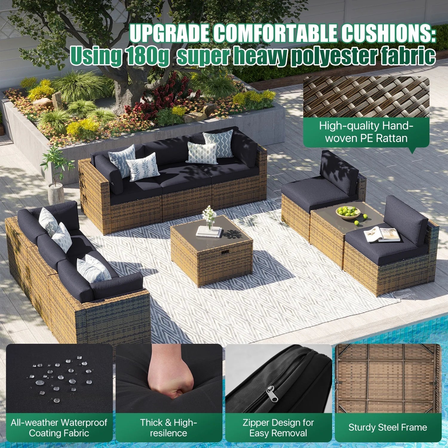 Clouddwell 10 Piece Patio Furniture Set Wicker Rattan Patio Conversation Set Outdoor Sectional Sofa Set with Coffee Table and Black Cushions(Waterproof Cover Included)