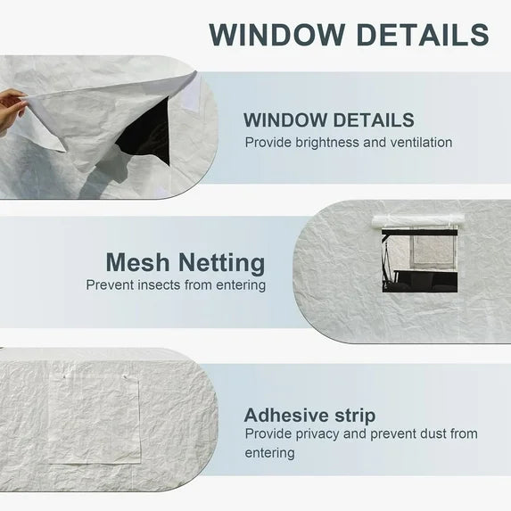 - Two 3.44 x 3.44 ft (1.05 x 1.05 m) windows feature outer flaps and inner mesh panels. Easily roll up the flaps with hook-and-loop closures to let fresh air in while keeping flies out. Close them to stay warm and dry.