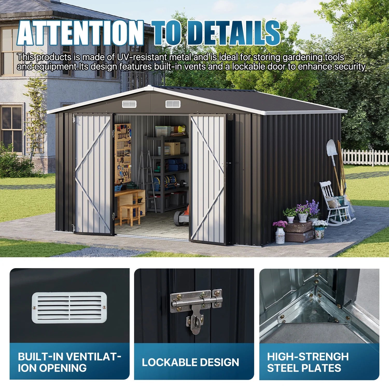 - Ample Spaciousness: Measuring 10x12 FT, this metal garden shed offers generous storage space for a wide range of items, including snow blowers, shovels, outdoor furniture, bicycles, toy cars, and much more. To enhance organization, you can use storage racks to neatly arrange items such as shovels, umbrellas, antennas, and other accessories.