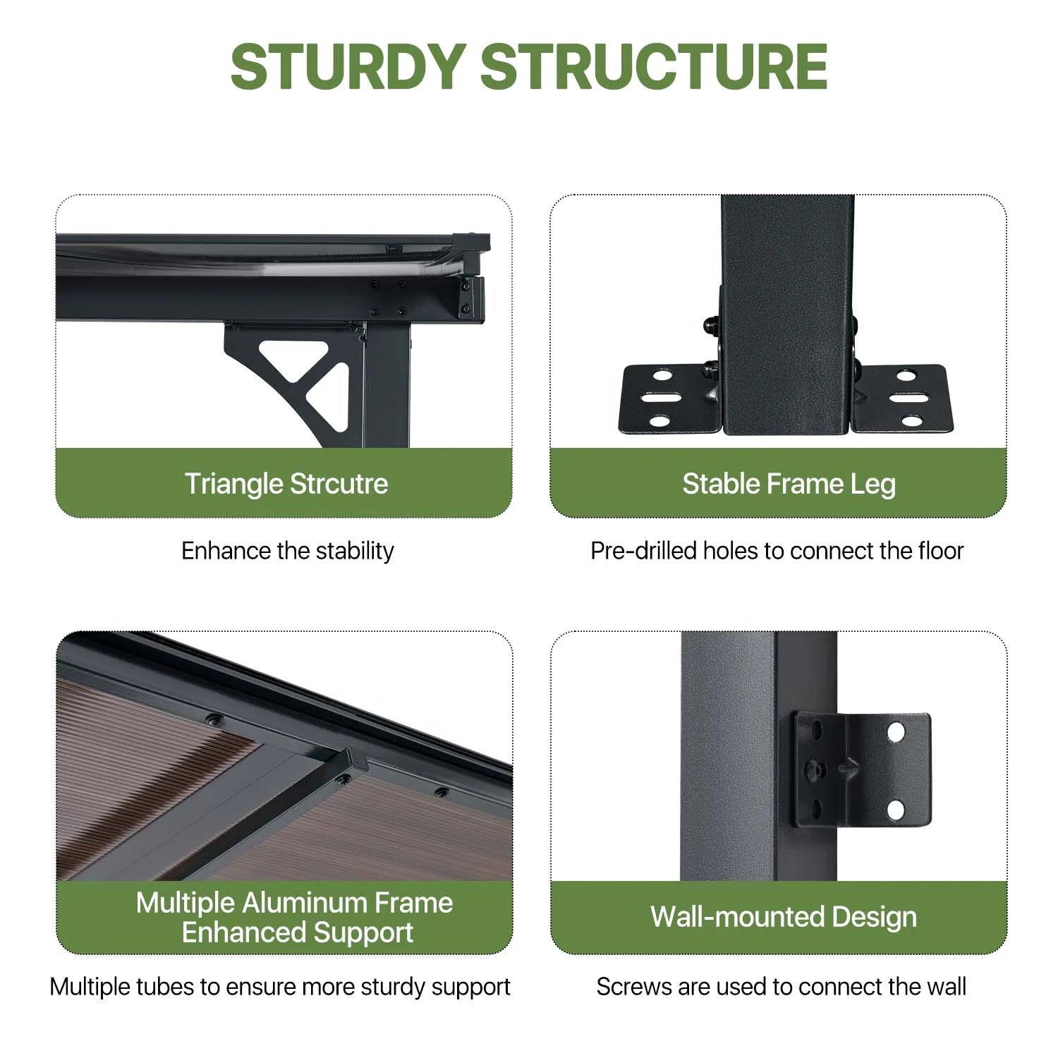 - 【Engineered for Superior Strength & Stability】 Rigorously tested all-aluminum structure with triangular bracing and dual wall-ground fixation delivers exceptional resilience. It confidently withstands 38 mph winds, carries 6 inches of snow, and boasts a 55 lbs/㎡ load capacity, ensuring unwavering stability in severe weather like heavy snow and rain.