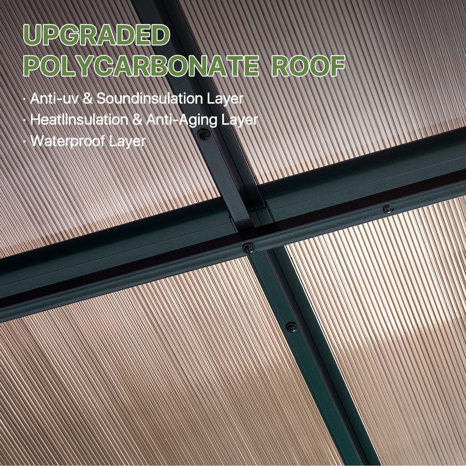 - 【Advanced Climate Control & Sun Protection】 Our multi-walled polycarbonate panels are your ultimate shield against the elements, blocking 99% of harmful UV rays and reducing solar heat gain by up to 80%. The innovative hollow-chamber design creates a naturally cooler area while allowing 92% of light through for a bright, glare-free ambiance.