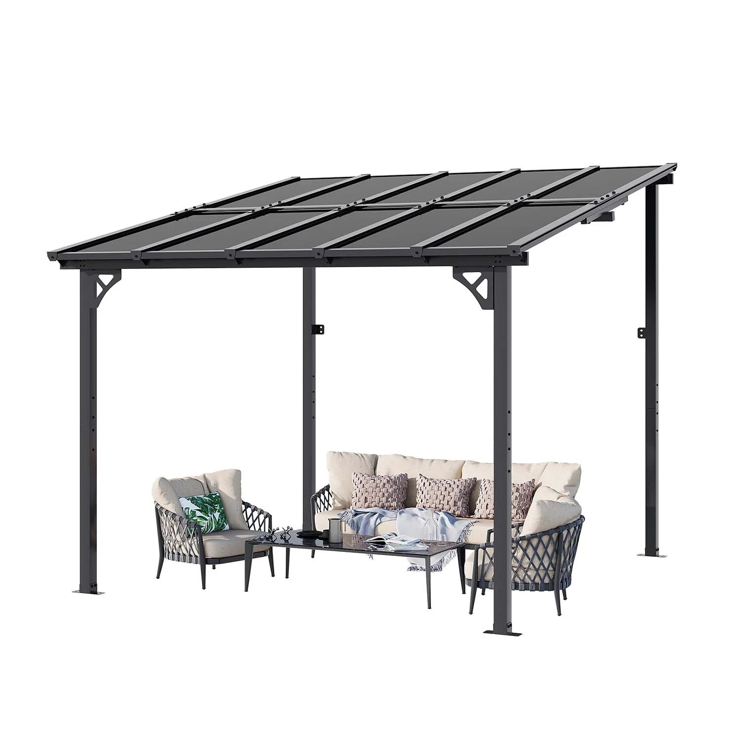 Clouddwell 10'x 10' Wall-Mounted Gazebo Pergola with Aluminum Top Frame & Polycarbonate Panel, Large Heavy-Duty Awnings for Backyard Black