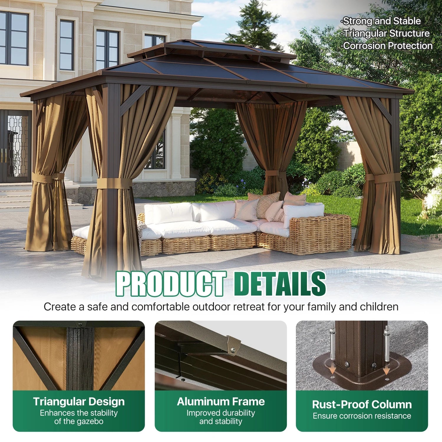 Clouddwell 10'x14' Hardtop Gazebo - Polycarbonate Double Roof with Netting & Curtains for Patio, Garden Sun Protection,Browm