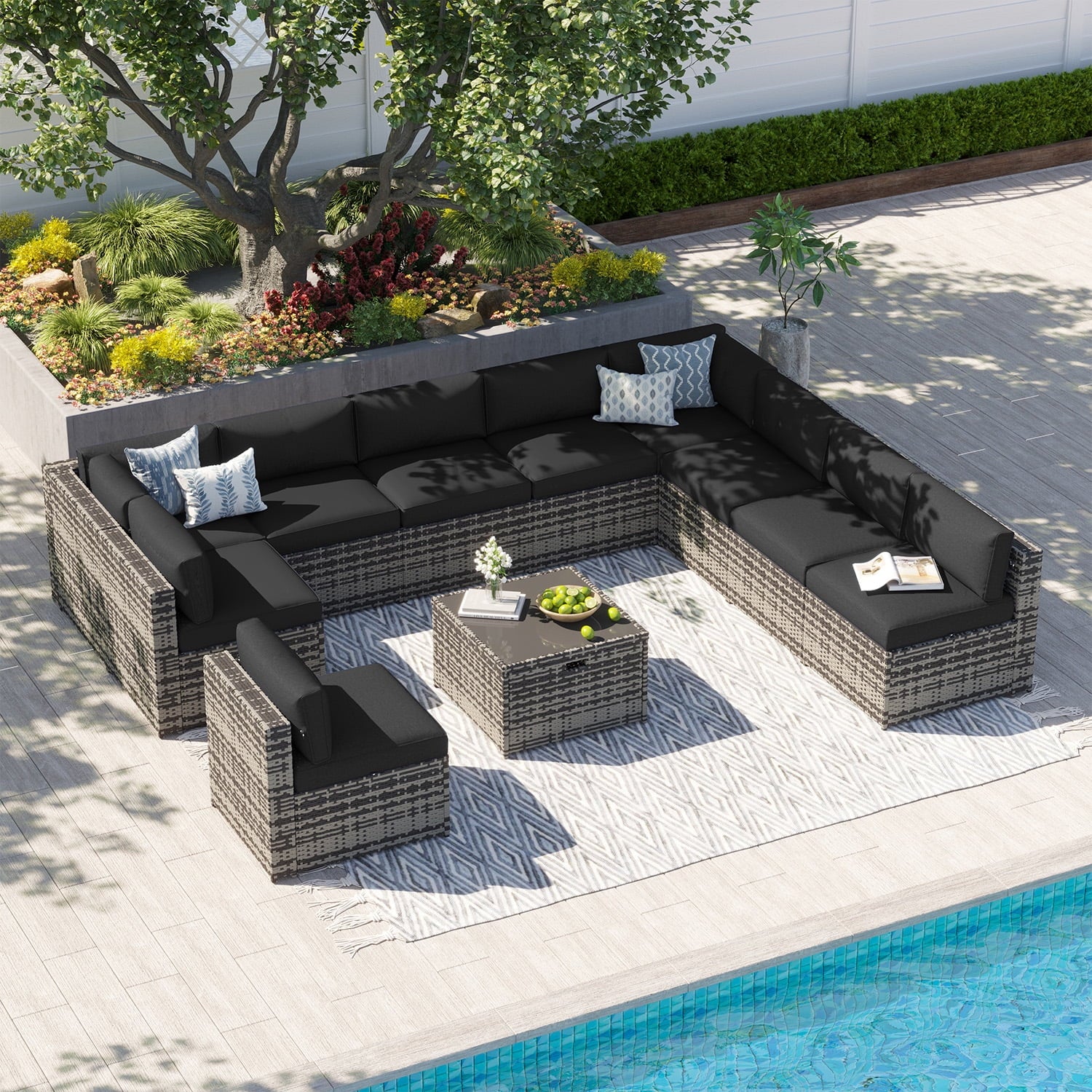 Clouddwell 11 Piece Patio Furniture Set Wicker Rattan Patio Conversation Set Outdoor Sectional Sofa Set with Coffee Table and Black Cushions(Waterproof Cover Included)