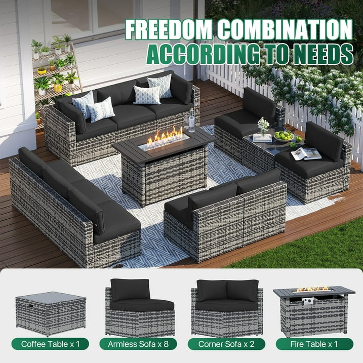 - Versatile and Comfortable: Our 12-piece patio set includes 8 armless sofas, 2 corner sofas,a firepit table and a coffee table, making it perfect for various outdoor spaces like patios, porches, backyards, balconies, poolside areas, and gardens. The plush cushions, filled with high-quality sponge or cotton, ensure superior comfort for an exceptional lounging experience