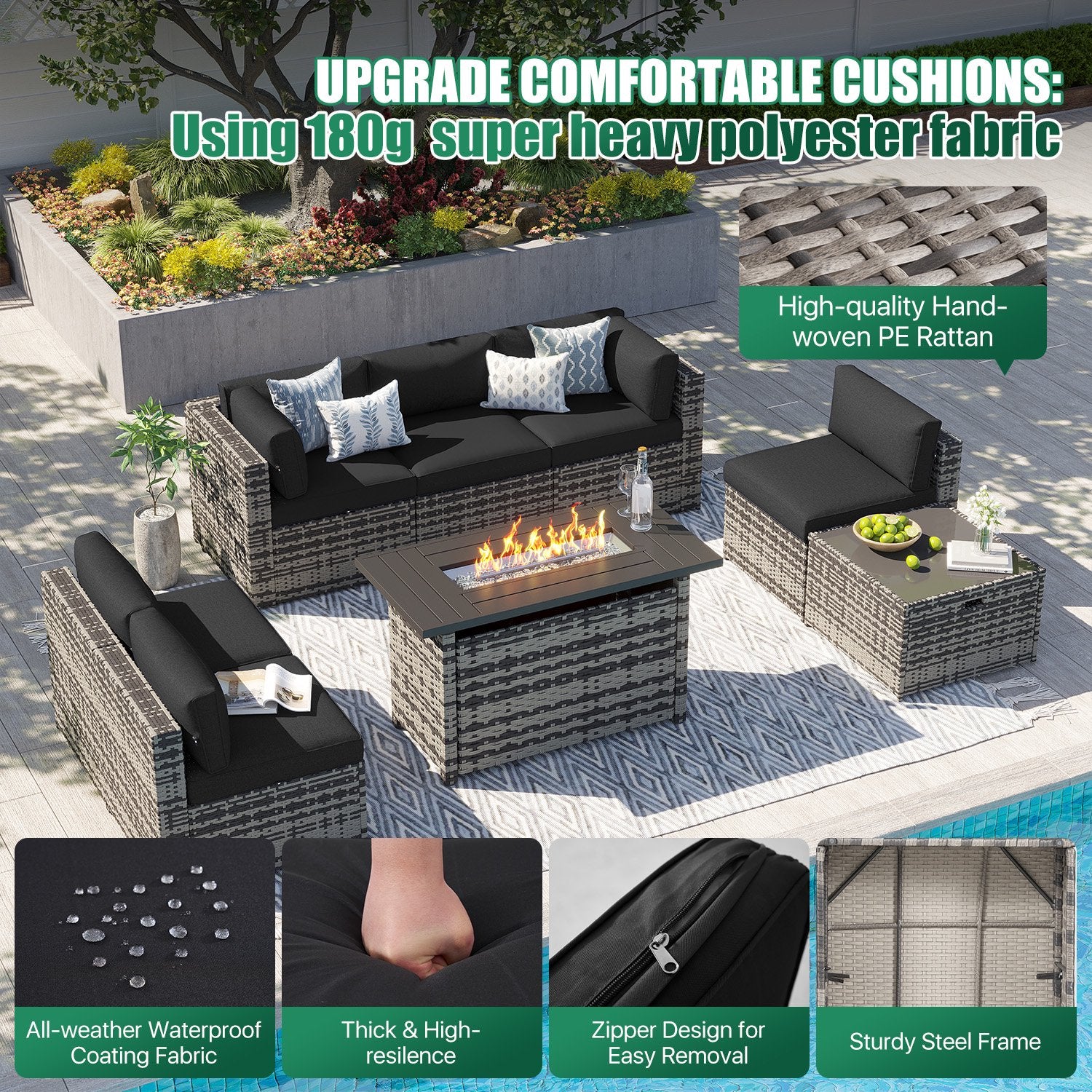 Clouddwell 12 Piece Patio Furniture Set with 44” Fire Pit Table Wicker Rattan Patio Conversation Set Outdoor Sectional Sofa Set with Coffee Table and Black Cushions(Waterproof Cover Included)