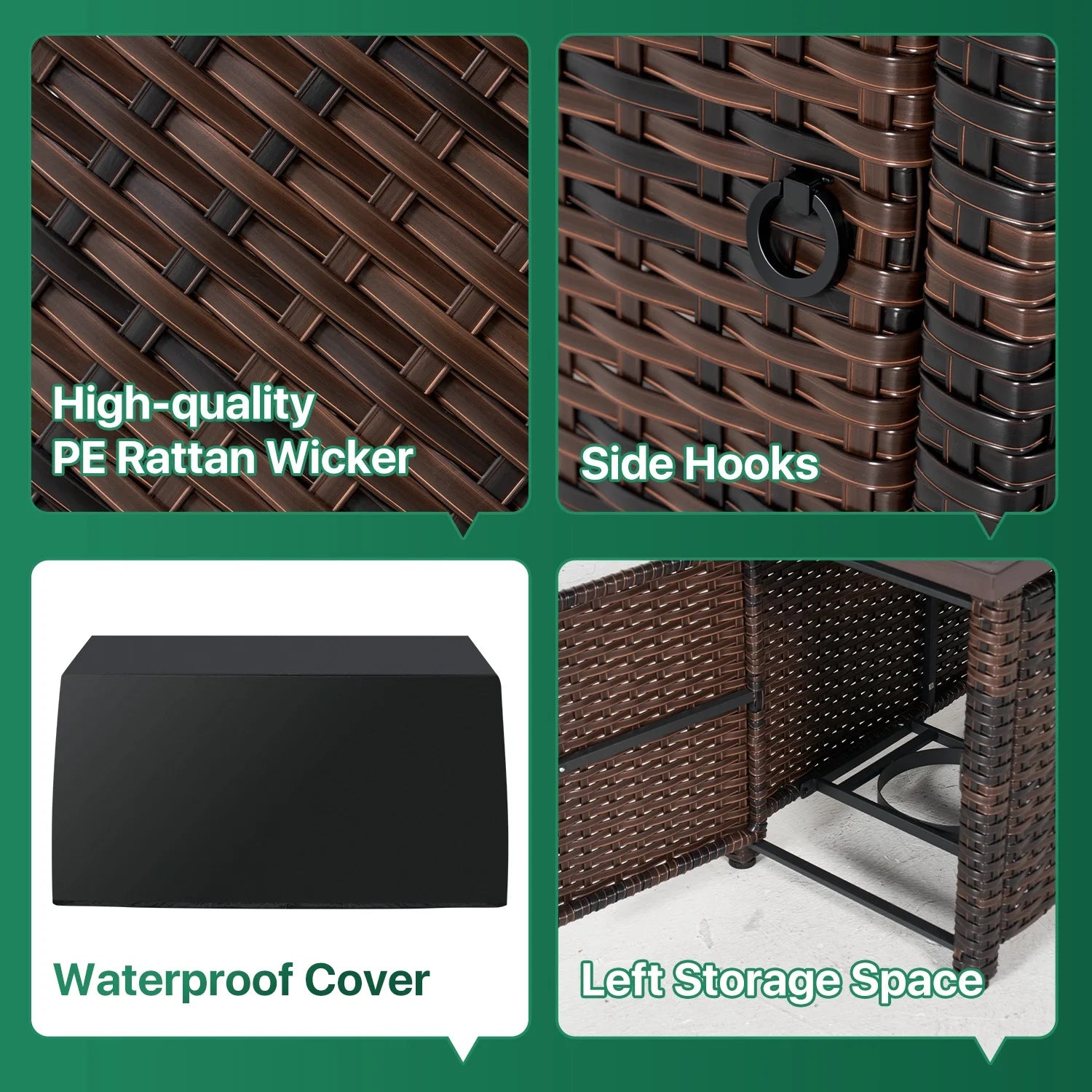 - Premium Quality: The set of furniture is crafted from powder-coated galvanized steel, offering exceptional durability and rust resistance. Besides, the robust design guarantees stability and safety, while the dark brown PE rattan material is built to endure diverse weather conditions like intense sunlight and humidity to fluctuating temperatures, which is Ideal for outdoor living
