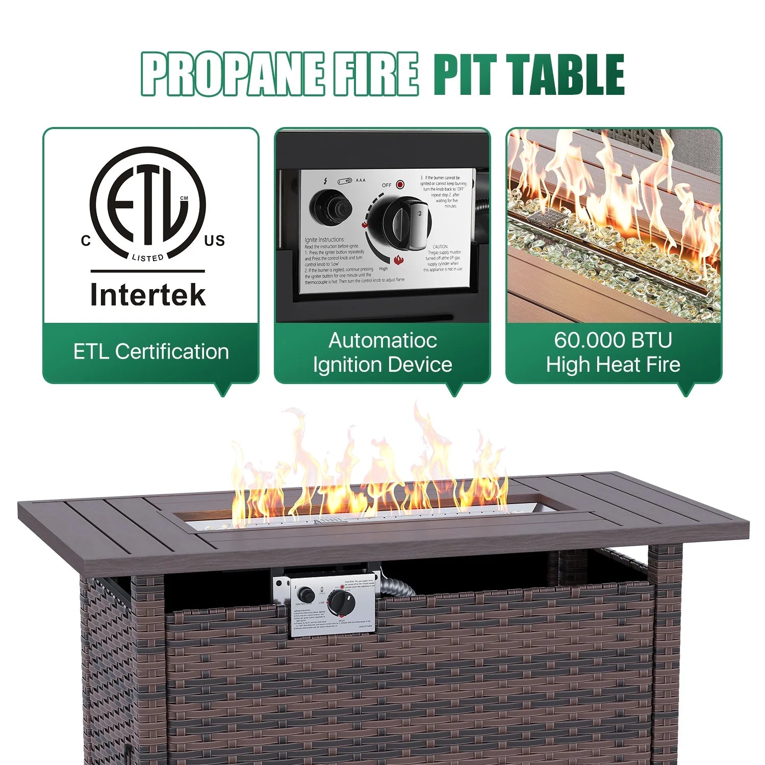 - 44" Fire Pit Table: Our CSA-certified propane fire pit is designed for everyday use, offering reliable and safe performance. Featuring an electronic ignition system, it allows for effortless operation. With a powerful heat output of up to 50,000 BTU, this patio fire pit provides ample warmth. (Note: The gas tank and propane combined must weigh under 20 lbs. Gas tank not included)