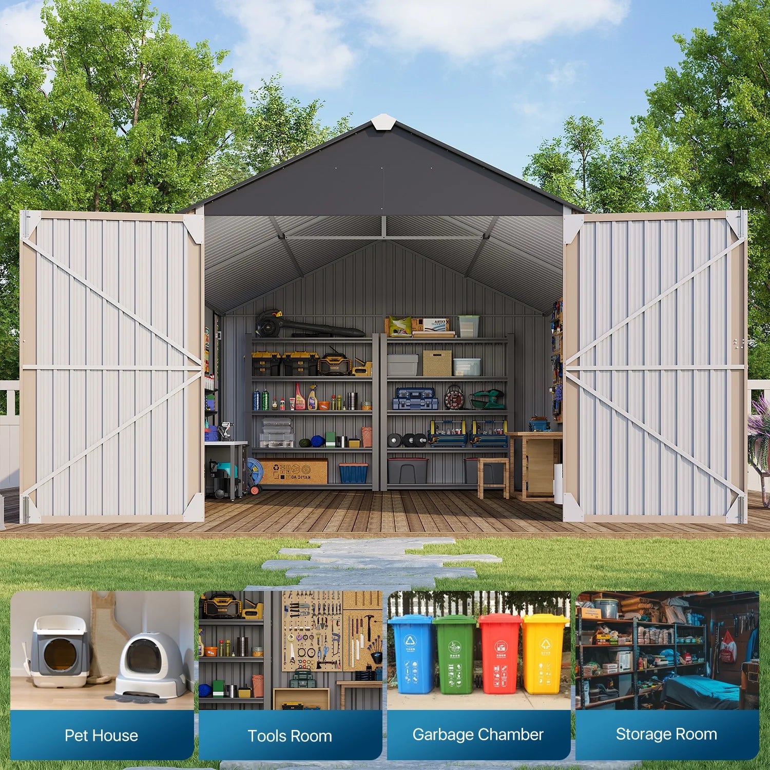 Clouddwell Extra Large Storage Shed for Vehicles & Sundries 11" Snow Load Double-Door All-Weather Garden Shed. Secure padlock-ready doors guard bikes, tools, or patio gear. Easy assembly with labeled parts.