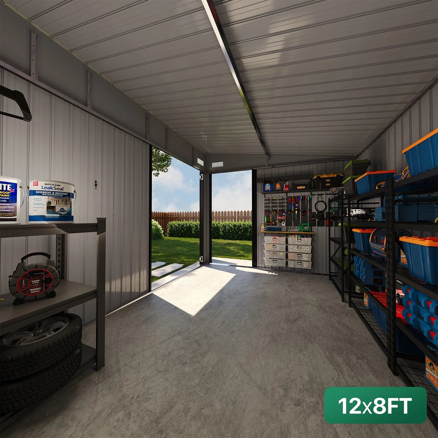 Clouddwell 12' x 8' Metal Storage Shed (434 cu. ft.) features three lockable doors for easy access, durable powder-coated steel construction, and a ventilated design with a sloped roof. This weather-resistant shed (7.3'D x 6.46'H x 11.48'W) provides secure outdoor storage for garden tools, bikes, and seasonal items, with easy assembly using included instructions. Built for long-lasting durability, the Clouddwell shed offers a sleek, low-maintenance solution for backyard, patio, or garage storage needs.