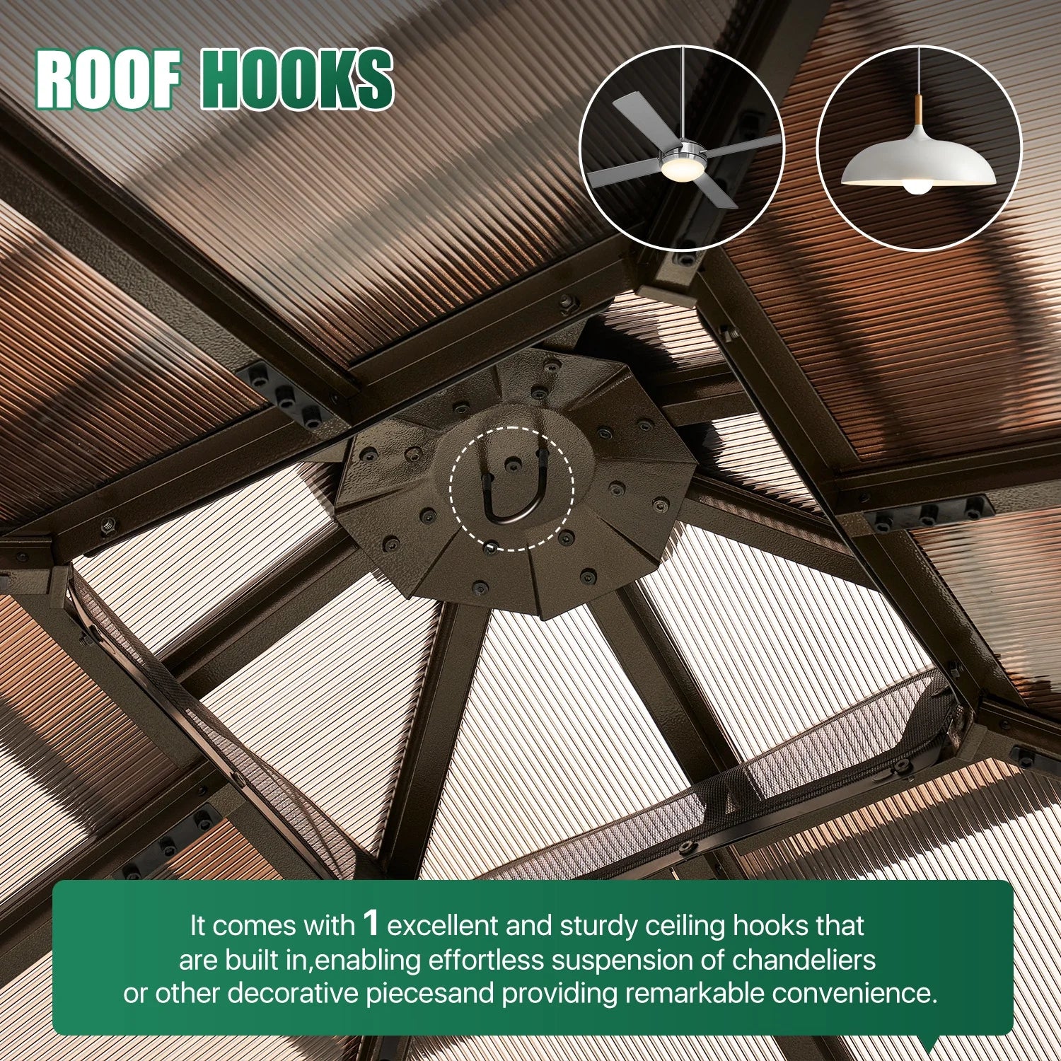 - Double-Layer Polycarbonate Top:This patio gazebo features a innovative double-layer polycarbonate roof that blocks harmful UV rays while promoting airflow. Thoughtfully designed hooks allow you to hang lights, fans, or decorative elements for added convenience and ambiance.