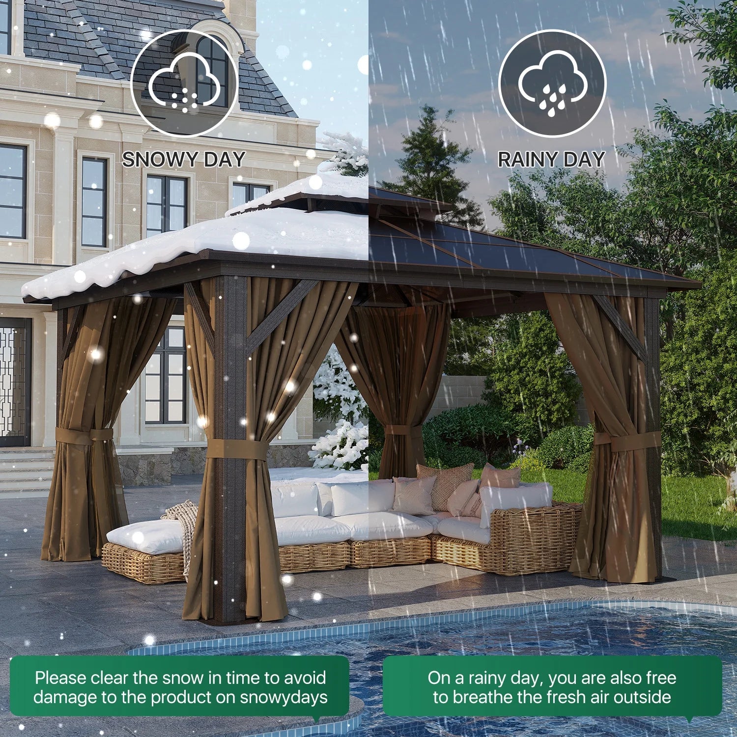 Clouddwell 12'x12' Hardtop Gazebo - Polycarbonate Double Roof with Netting & Curtains for Patio, Garden Sun Protection,Browm