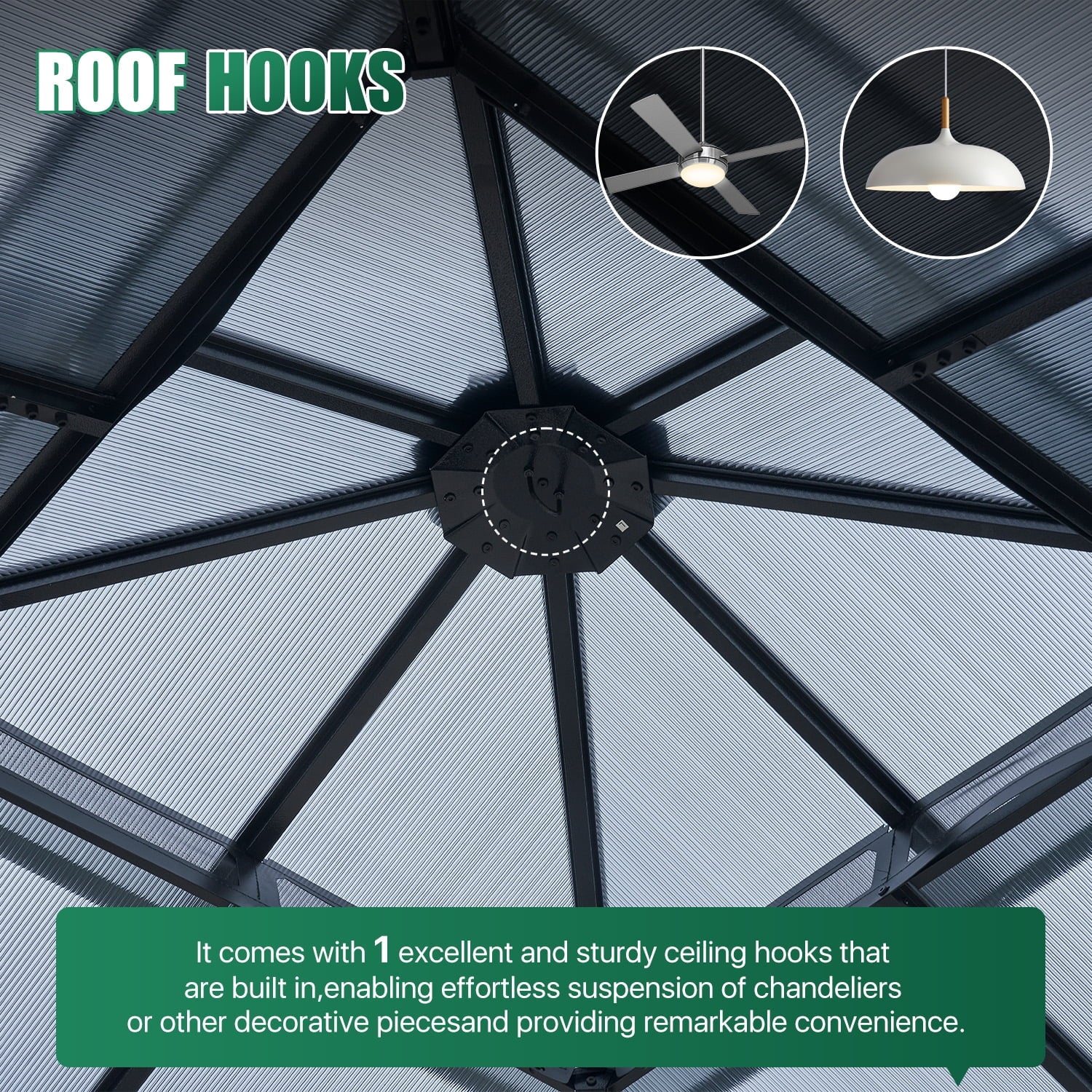 - Double-Layer Polycarbonate Top:This patio gazebo features a innovative double-layer polycarbonate roof that blocks harmful UV rays while promoting airflow. Thoughtfully designed hooks allow you to hang lights, fans, or decorative elements for added convenience and ambiance.