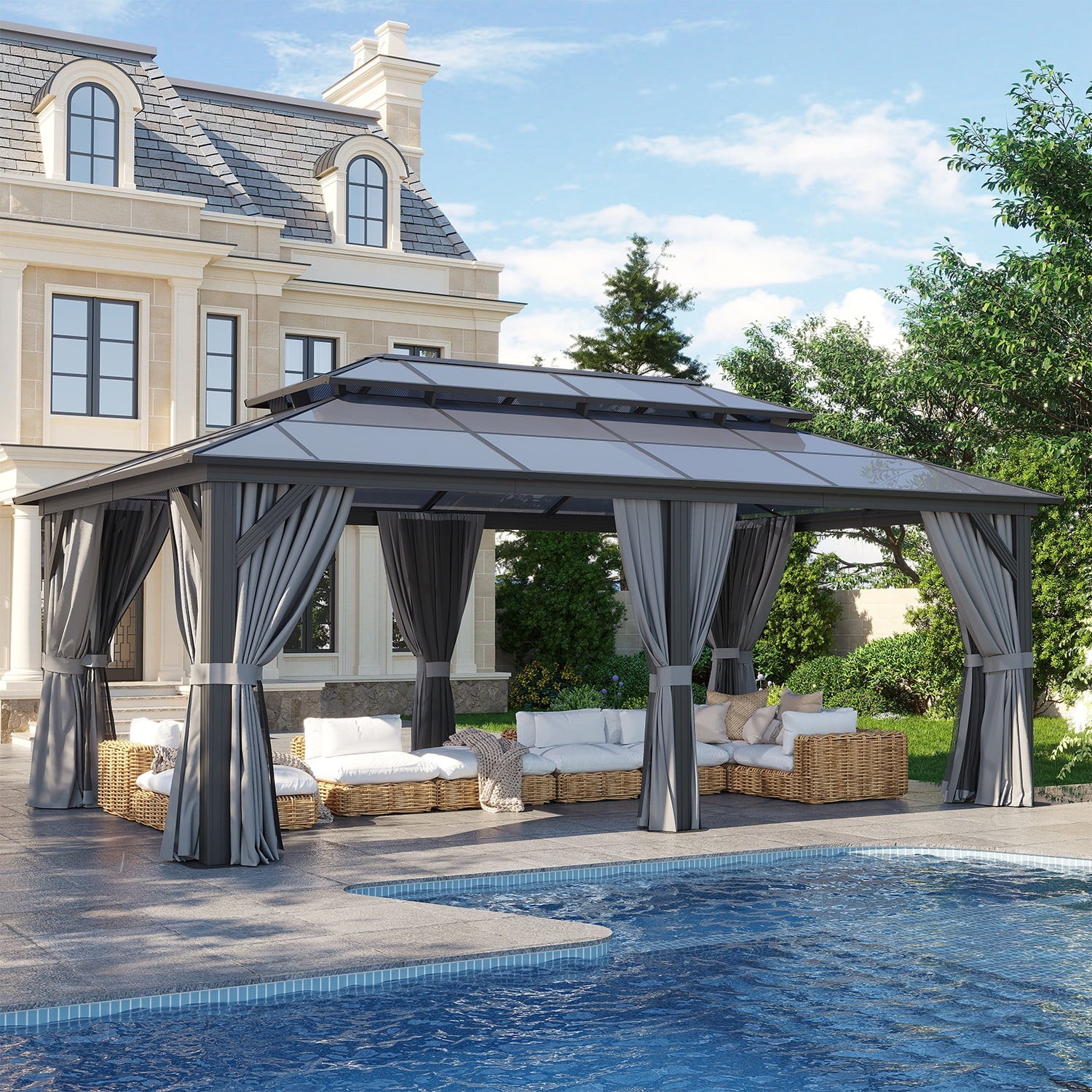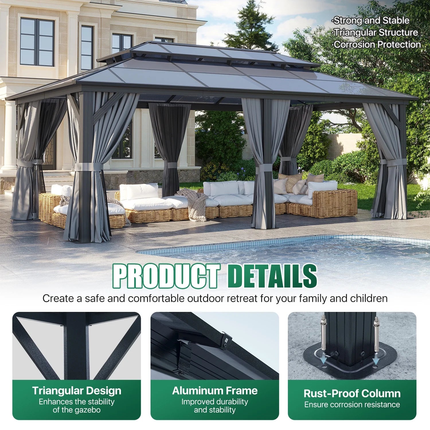 Clouddwell 12'x20' Hardtop Gazebo - Polycarbonate Double Roof with Netting & Curtains for Patio, Garden Sun Protection,Gray