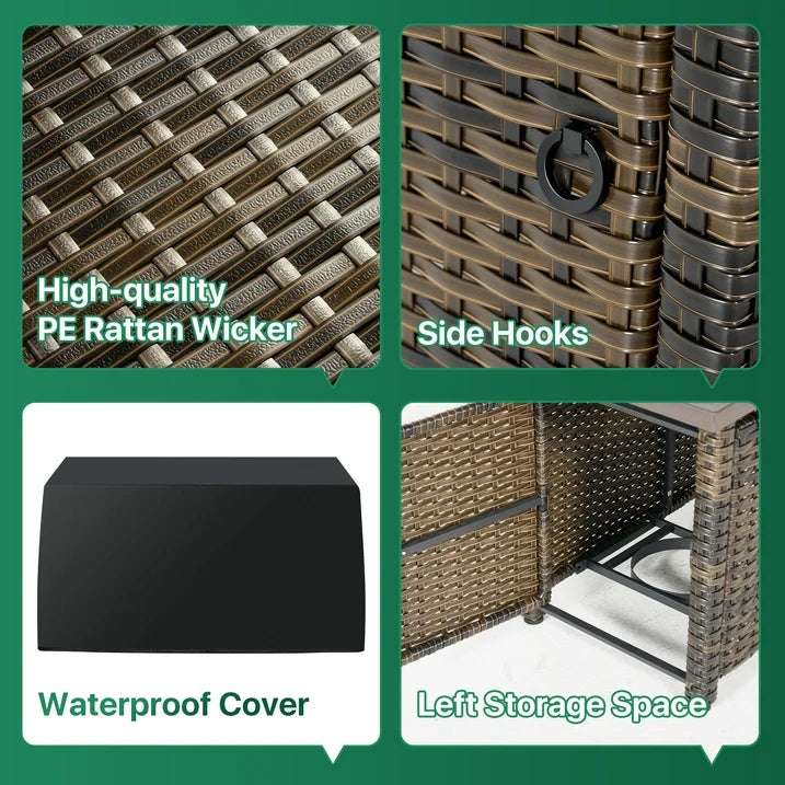- Premium Quality: The set of furniture is crafted from powder-coated galvanized steel, offering exceptional durability and rust resistance. Besides, the robust design guarantees stability and safety, while the brown PE rattan material is built to endure diverse weather conditions like intense sunlight and humidity to fluctuating temperatures, which is Ideal for outdoor living