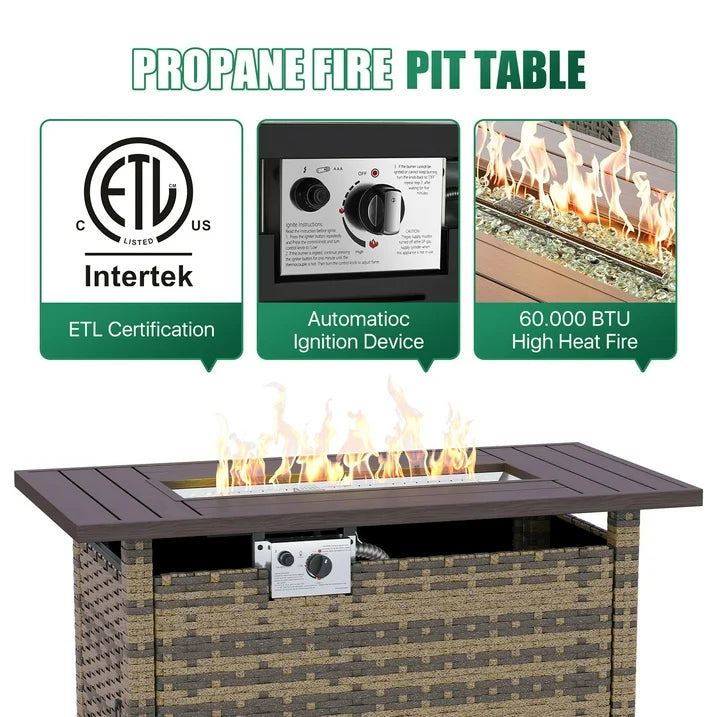 - 44" Fire Pit Table: Our CSA-certified propane fire pit is designed for everyday use, offering reliable and safe performance. Featuring an electronic ignition system, it allows for effortless operation. With a powerful heat output of up to 50,000 BTU, this patio fire pit provides ample warmth. (Note: The gas tank and propane combined must weigh under 20 lbs. Gas tank not included)