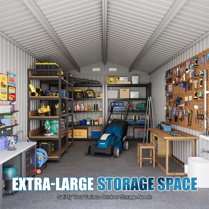 - Ample Spaciousness: Measuring 08x15 FT, this metal garden shed offers generous storage space for a wide range of items, including snow blowers, shovels, outdoor furniture, bicycles, toy cars, and much more. To enhance organization, you can use storage racks to neatly arrange items such as shovels, umbrellas, antennas, and other accessories.