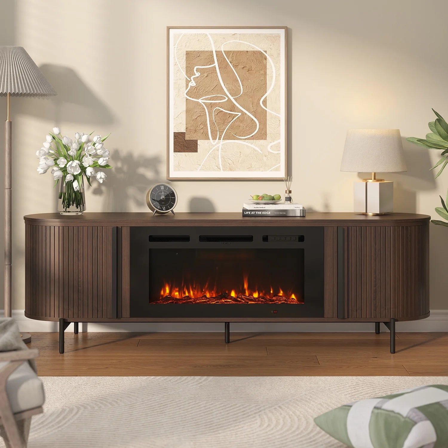 - Unique and Luxury Style: Featuring a distinctive wave-like fluted panel and curved profile, the fireplace TV stand allows it to blend effortlessly with various modern furniture styles. Its white faux marble top replicates authentic marble patterns, offering a luxurious aesthetic at a lighter weight