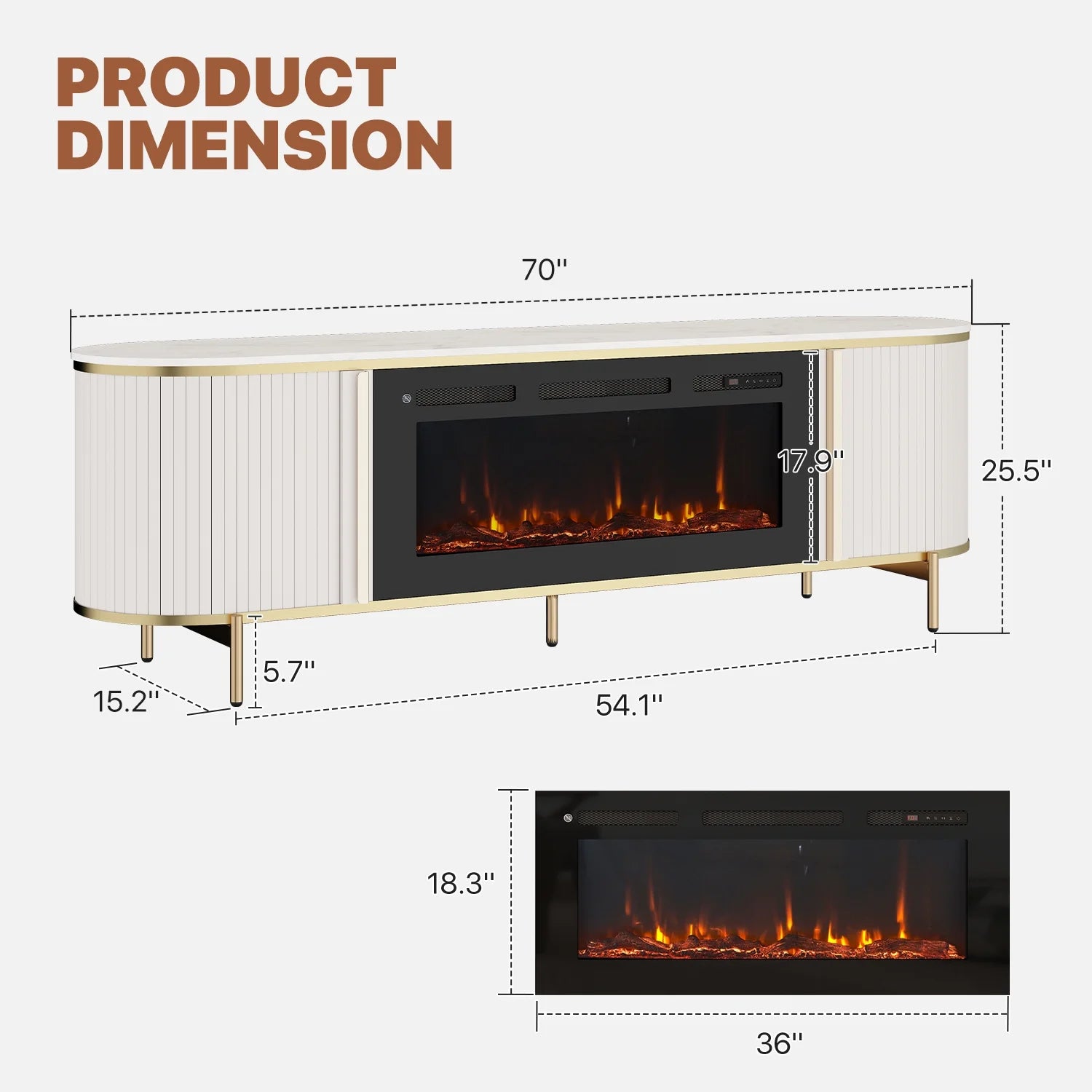 - Sleek Modern Design: Our 70 TV stand with fireplace is designed with cable holes that help keep the wires order and clean. Plus, the gold metal cylindrical legs add to its contemporary vibe, creating a personalized and distinctive aesthetic