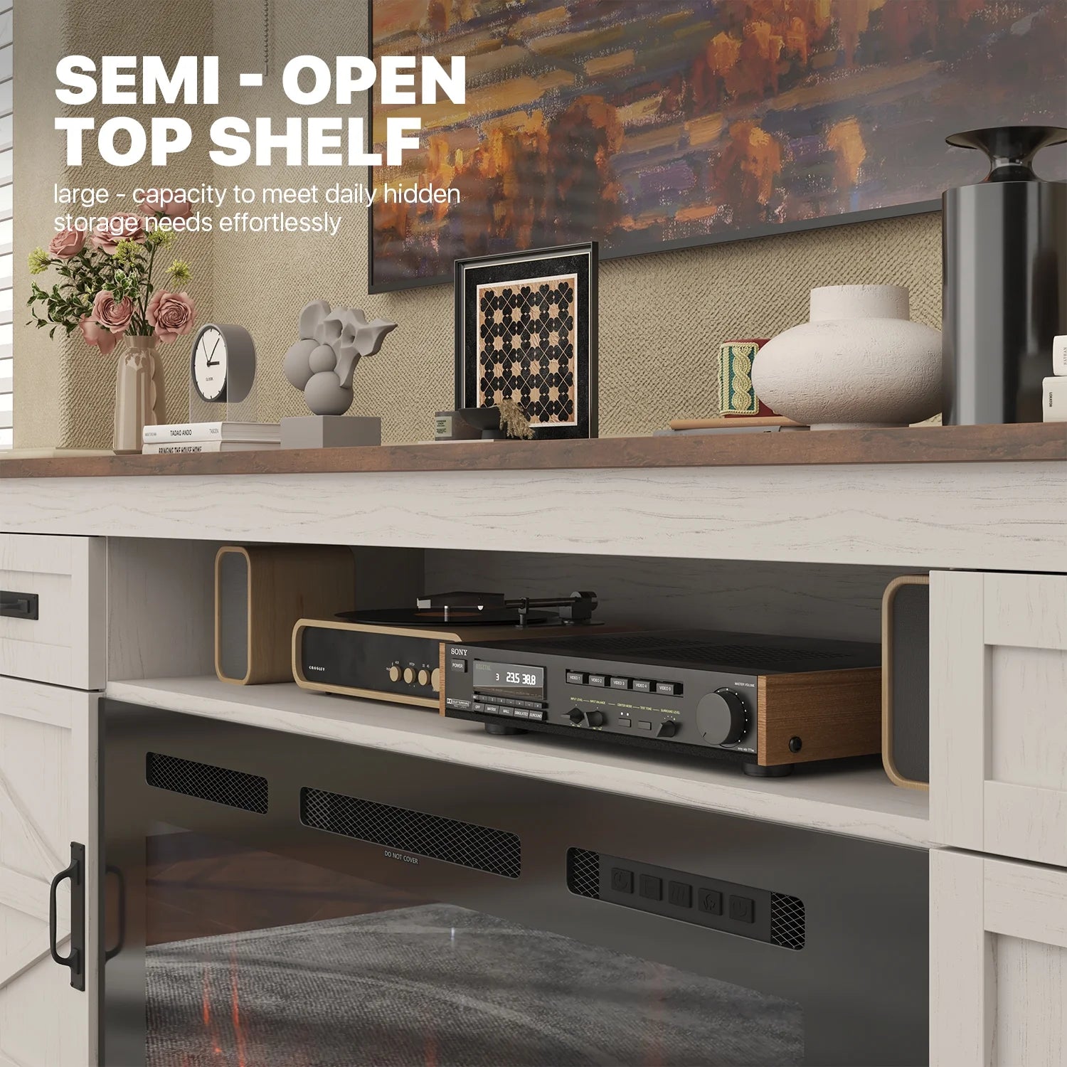 Sonegra Fireplace TV Stand with Barn Door for TVs up to 80", Farmhouse 70" Fireplace Entertainment Center, TV Console with Storage Cabinets for Living Room, White
