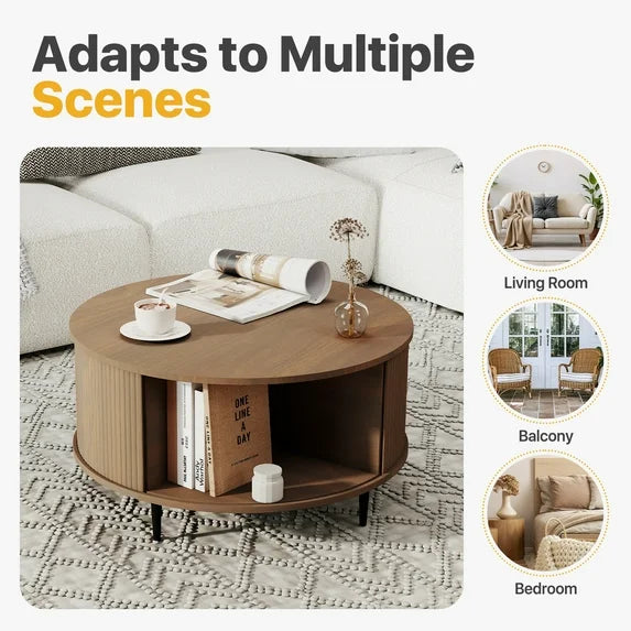 Sonegra Mid-Century Modern Round Coffee Table - Walnut Wood with Sliding Door Storage for Living Room