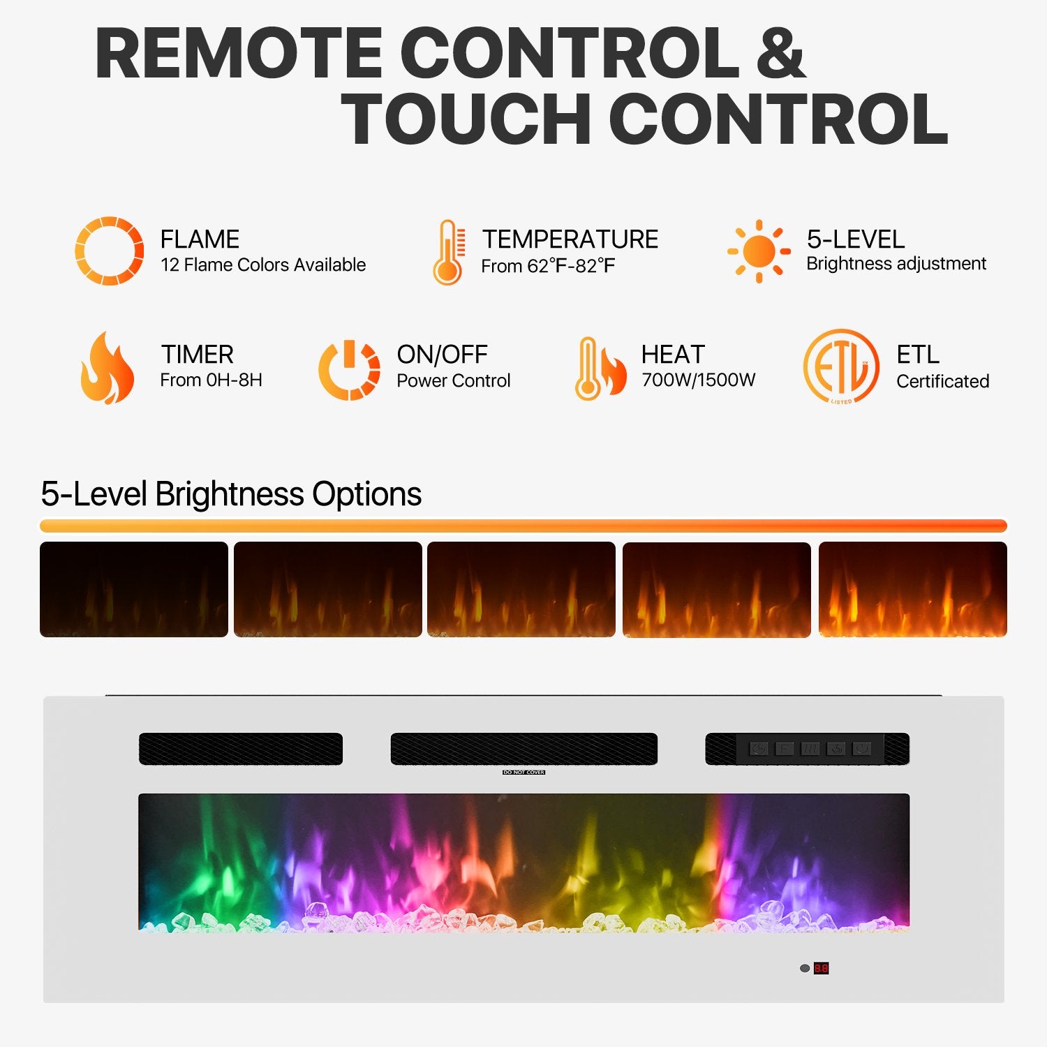 - Our 36 inch size fireplace with realistic crystal stones can offer 5 levels of flame brightness. With multiple lighting modes and 12 colors of backlight. Also, Our fireplace tv stand provides temperature control function. You are allowed to adjust the temperature of from 62°F-82°F and the time from 0-8H with the remote control