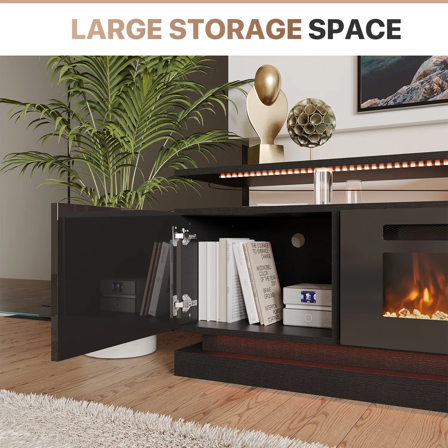 Sonegra Modern Fireplace TV Stand for TVs Up to 80" with Music Sync LED, 70" Entertainment Center with Electric Fireplace, TV Console with Storage Cabinets for Living Room, Black