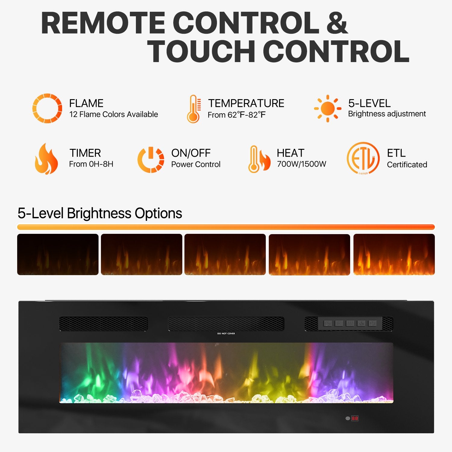 - Our 36 inch size fireplace with realistic crystal stones can offer 5 levels of flame brightness. With multiple lighting modes and 12 colors of backlight. Also, Our fireplace tv stand provides temperature control function. You are allowed to adjust the temperature of from 62°F-82°F and the time from 0-8H with the remote control