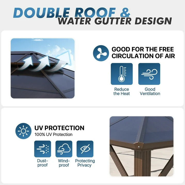 - Innovative Double-Layer Polycarbonate Roof Stay protected under this gazebo’s advanced dual-layer polycarbonate roof, designed to block harmful UV rays while enhancing airflow. Integrated hanging hooks offer added convenience, allowing you to easily suspend lights, fans, or decorative accents for a personalized outdoor ambiance.