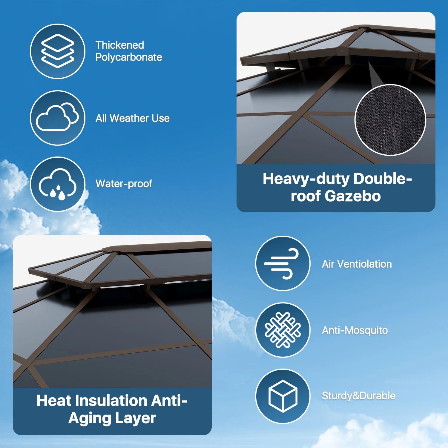 Sunmthink 10' x 12'Hardtop Gazebo,Polycarbonate Double Roof,Aluminum Frame with Curtains and Netting for Patio,Garden,Brown