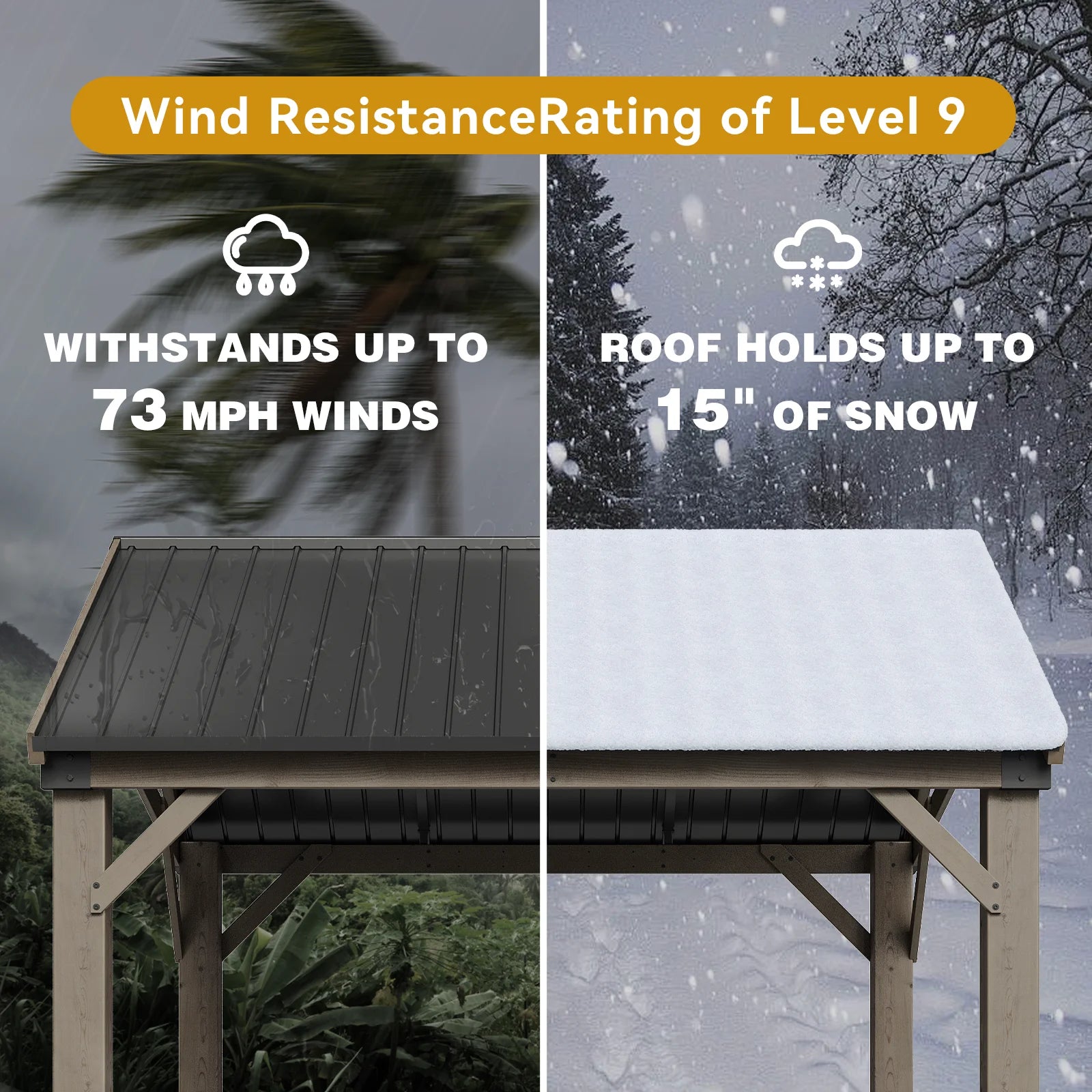 - Galvanized Steel Roof: This wood gazebo features a galvanized steel roof designed for superior ventilation and airflow. Its rust-resistant surface blocks up to 92% of UV rays, protecting you from direct sunlight while enhancing durability against strong winds and heavy rain. Perfect for year-round outdoor enjoyment.