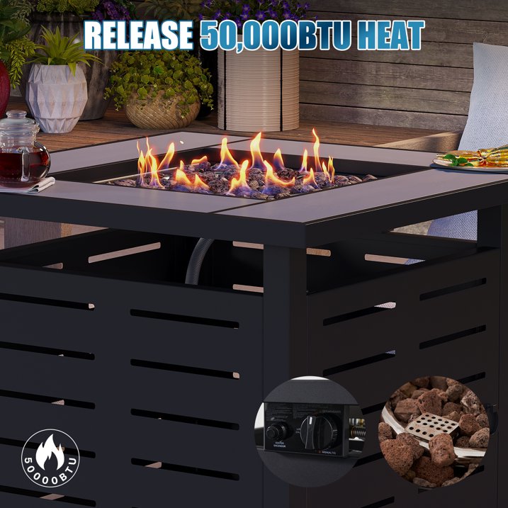 Sunmthink 28-Inch Smart Gas Fire Table – Redefining Outdoor Living Aesthetics Sunmthink masterfully blends technology with natural elements to create this outdoor fire table that combines functionality and aesthetic appeal. Equipped with a 50,000 BTU high-efficiency heating system, it instantly dispels the chill of late autumn, creating a warm and pleasant microclimate for gatherings of 8-10 people, ensuring your outdoor activities are no longer limited by seasonal changes.The tabletop is crafted from specially engineered stone, fired at high temperatures to achieve exceptional weather resistance. This unique manufacturing process not only effectively resists UV radiation but also provides scratch-resistant and durable properties. The innovative dual-purpose design, paired with a custom fireproof cover, allows effortless switching between a practical dining table and a cozy fire pit: by day, it serves as stylish patio furniture, and by night, it becomes a warm focal point that brings people together.Featuring advanced smokeless combustion technology, the fire table ensures efficient burning through precisely calculated gas mixing, eliminating the smoke issues commonly associated with traditional open flames. The specially designed pulse ignition system, powered by AAA batteries, offers an ultra-long lifespan of 35,000 ignitions and an ignition frequency of ≥6Hz. With just a gentle turn of the control knob, you can instantly enjoy the warmth of a clean, consistent flame.From family dinners to friendly gatherings, from romantic evenings to festive celebrations, this fire table—integrating innovative technology and user-friendly design—is the ideal choice to elevate your outdoor living experience, making every moment together a cherished memory.