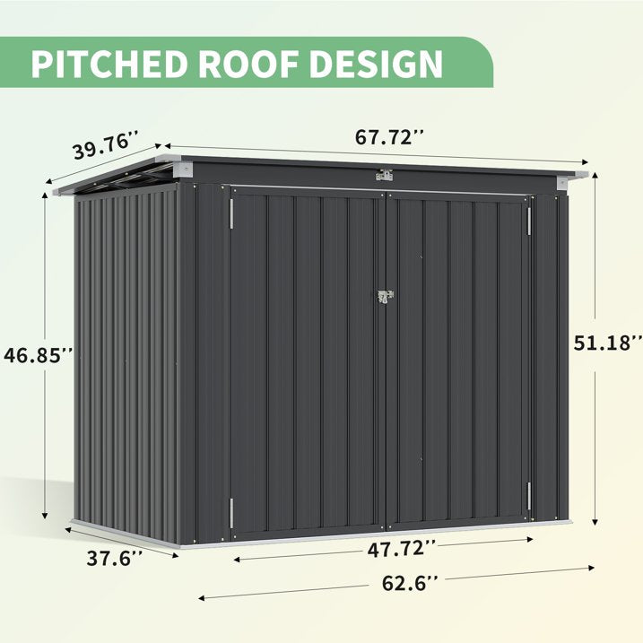 Sunmthink’s storage shed comes in a classic black color, our trash storage shed can store 2 trash cans, providing ample space to keep your trash organized and hidden. The size of 59.8"L x 32.3"W x 47.2"H will accommodate most trash cans. Our sheds and outdoor storage is made of galvanized steel to ensure long-lasting durability and resist rust and corrosion. The sloped roof design allows drainage, two lockable wide swing doors provide easy access to stored items, and the pneumatic lift helps open and close the lid. It is easy to clean and maintain with minimal tools required.