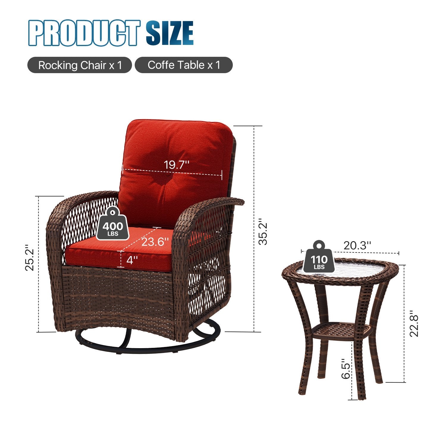 Sunmthink 3-Piece Patio Furniture Set with Swivel Rocking Chairs and Side Table, Thickened Cushions Outdoor Wicker Bistro for Porch Deck Backyard (Red)