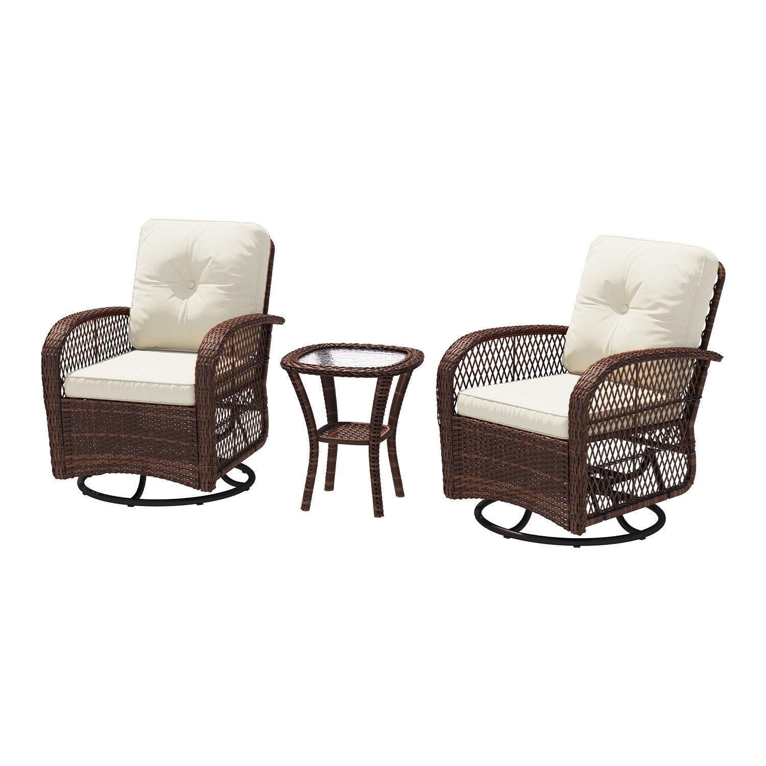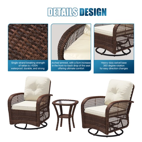 Sunmthink Outdoor Swivel Rocker Set: Durable & Comfortable Elegance The Sunmthink 3-piece patio set masterfully combines robust construction with inviting comfort. Engineered for lasting use, the swivel rockers and table offer exceptional weight capacity and stability. Featuring an upgraded ergonomic design with increased seat depth and height adjustment, it delivers a more natural, smoother rocking experience without forward tilt, complemented by firmer, plusher cushions for superior relaxation.Crafted with elegant, all-weather wicker in intricate patterns, this set is built to resist deformation and maintain its beauty. The latest design introduces a curved rattan tabletop and gracefully arched armrests, while simplified assembly with guided nuts ensures a quick setup. Effortlessly enhancing any porch, deck, or backyard, Sunmthink creates the perfect oasis of style and comfort.