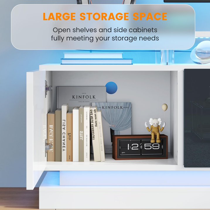 - Ample Storage Space: Organize your space with the generous storage capacity of this fireplace TV stand. The wide tabletop and two side cabinets offer organized space for all your essentials, from game consoles and books to DVD players, helping you maintain a tidy and stylish room