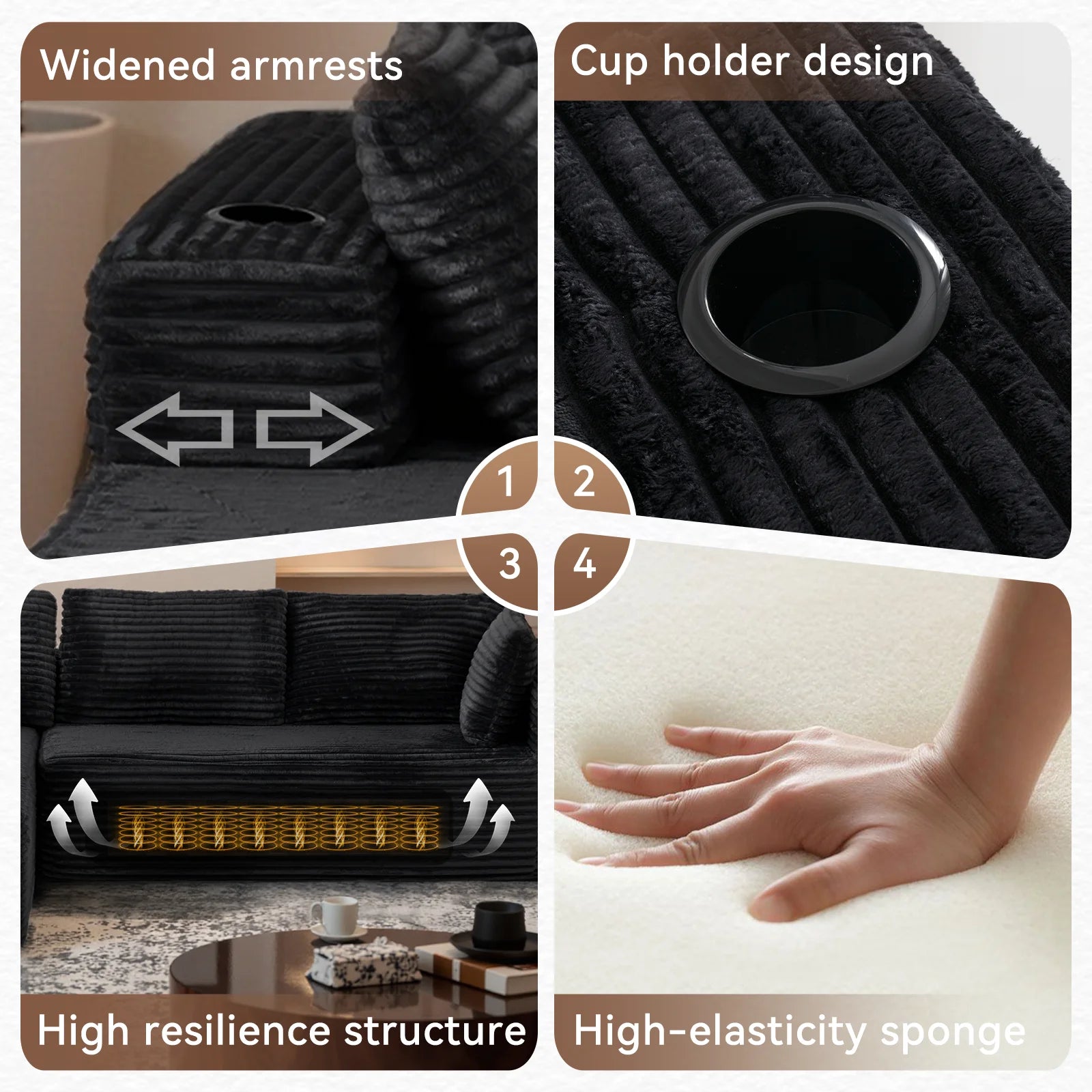 Sunmthink Cloud Couch Corduroy Modular Sectional Sofa L-Shape Boneless Couch with Wide Armrests and Cup Holders for Living Room Bedroom, No Assembly Required (Black)