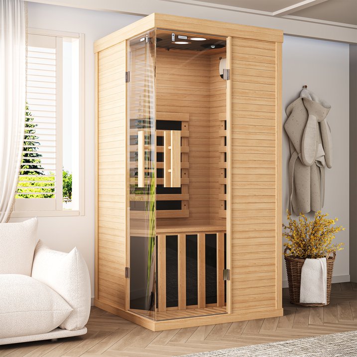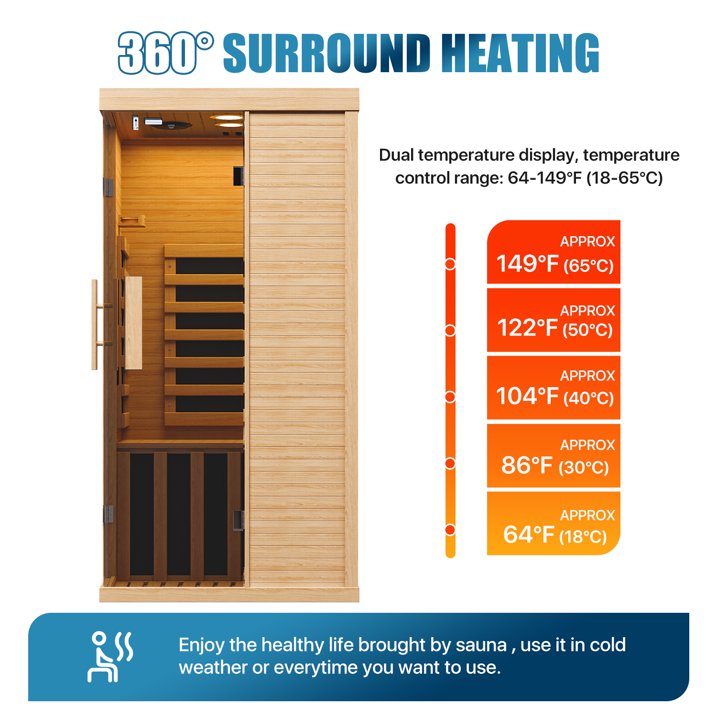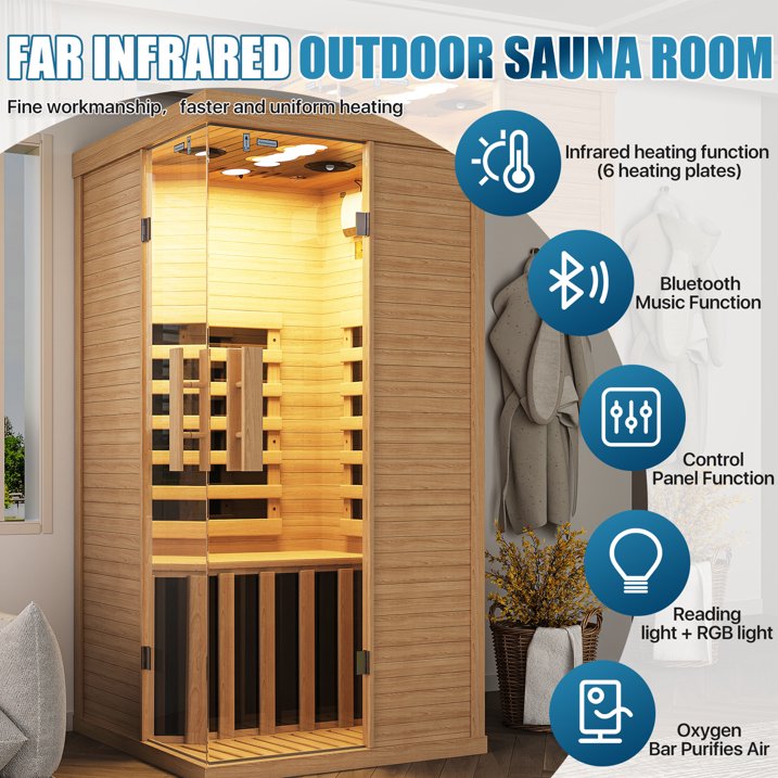 Sunmthink Full Spectrum Infrared Home Sauna – Your Personal Wellness Retreat Transform your home into a sanctuary of relaxation and rejuvenation with the Sunmthink Infrared Sauna. Crafted from natural Western Hemlock wood, this elegantly designed sauna combines advanced heating technology with user-friendly features to deliver a complete wellness experience—all without leaving your home. Key Features & Benefits: Full Spectrum Infrared Technology: Equipped with 6 efficient far-infrared carbon heating panels and 850W optimized system, this sauna delivers deep-penetrating heat that promotes detoxification, improves circulation, and soothes tired muscles. Immersive Ambiance & Entertainment: Built-in Bluetooth speakers and 11-color RGB lighting system let you set the mood—whether you're unwinding to music, a podcast, or soft reading light. Pure Air & Easy Control: The integrated oxygen bar maintains fresh airflow, while the soft-touch LED control panel offers precise temperature (18–65°C / 64–149°F) and timer settings (1–99 mins) for a customized session. Spacious Yet Compact Design: Measuring 33.5″ W x 33.5″ D x 66.9″ H and weighing 165.8 lbs (75.2 kg), this one-person sauna fits neatly into bedrooms, home gyms, or larger closets while offering enhanced interior space. Safe & Simple Operation: Runs on 120V AC power at 850W, with reinforced hemlock walls that ensure both safety and thermal efficiency. Specifications at a Glance: Material: Western Hemlock Wood Power: 850W Voltage: 120V / 60Hz Heating Panels: 6 Far-Infrared Carbon Plates Lighting: 11-Color RGB System + Reading Lamp Features: Bluetooth Speaker, Oxygen Bar, Digital Control Interior Dimensions: 33.5″ x 33.5″ x 66.9″ (85 x 85 x 170 cm) Net Weight: 165.8 lbs (75.2 kg) Step inside the Sunmthink Sauna—where innovative technology meets everyday luxury. Recharge, refresh, and restore your well-being in a space designed just for you.