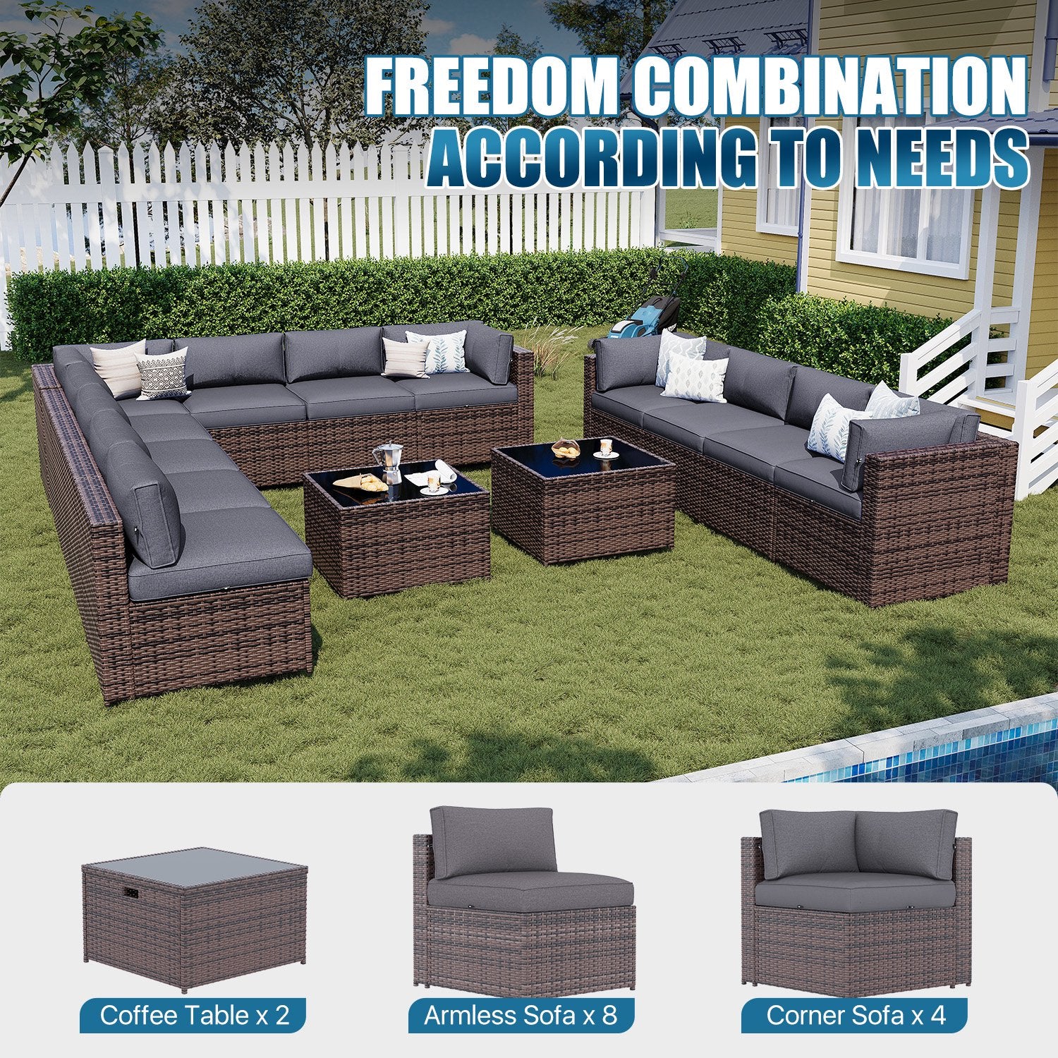 - All-Weather Durability: Crafted with UV-resistant resin wicker and rustproof steel framing, this modular sofa set thrives in sun, rain, or snow. The weatherproof construction resists fading, cracking, and corrosion, ensuring long-lasting performance in any season. Cushion and pillow fabrics can shake off splashes or drizzle easily, but use the included waterproof cover during heavy rain or extended outdoor storage to maximize protection.
