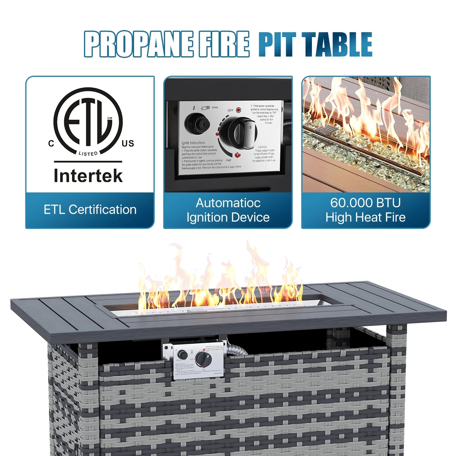 - Unmatched Ambiance and Performance: Experience the ultimate outdoor comfort with our 50,000 BTU fire pit table, designed to elevate your gatherings in any season. Whether it's a cool summer evening or a frosty winter night, this propane-powered fire table delivers consistent, eco-friendly warmth. The explosion-proof glass stones not only enhance the visual appeal but also ensure a safe and refreshing atmosphere, allowing you to relax without a care in the world.